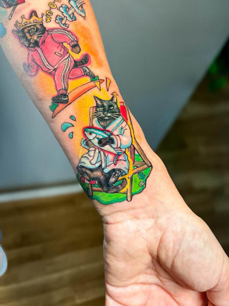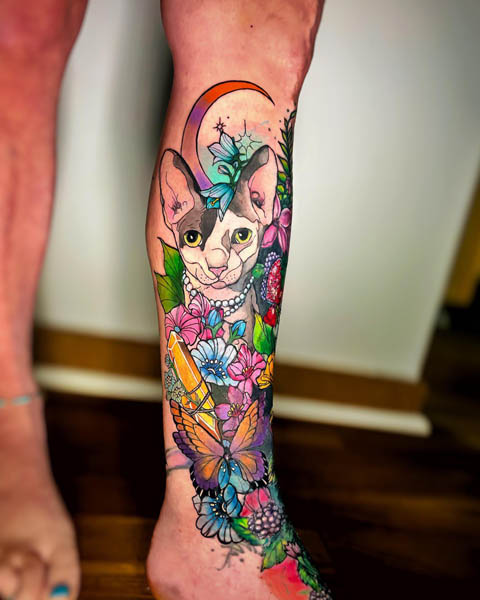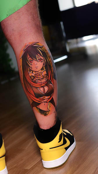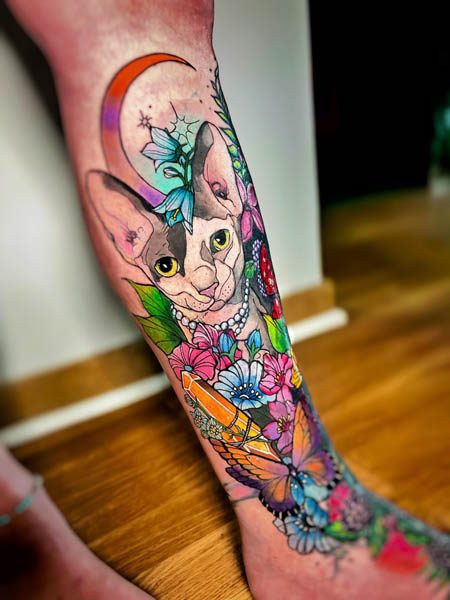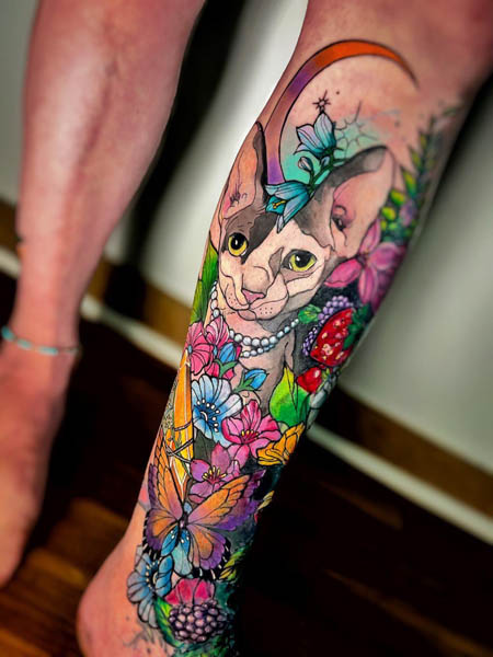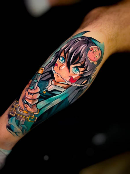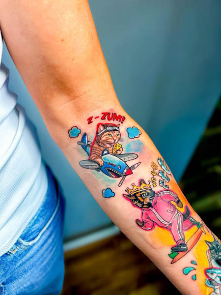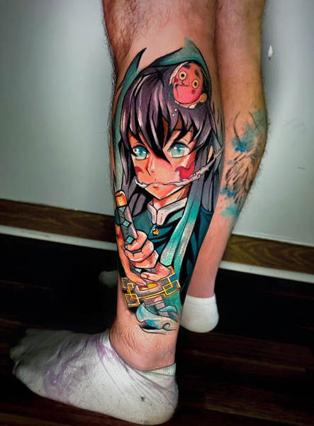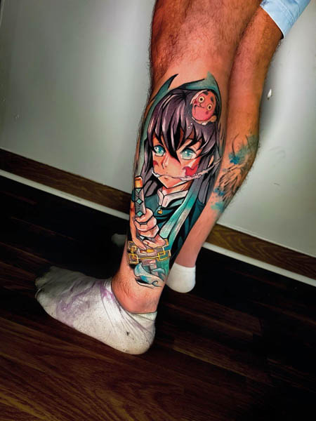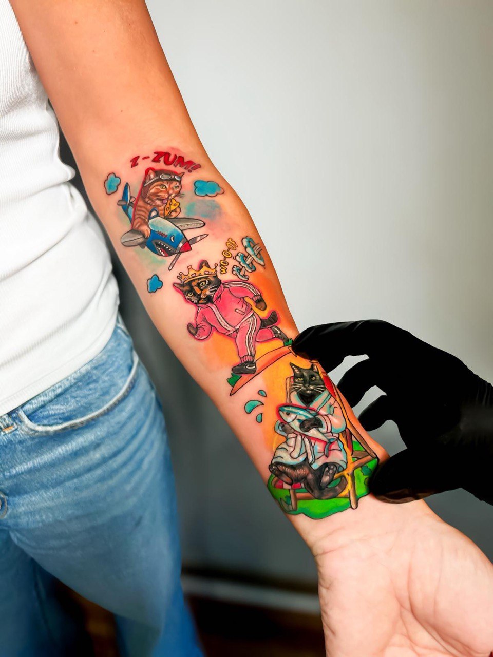 I’ve always loved pop culture, gaming, and especially anime — particularly the legendary 90s classics like Sailor Moon, Evangelion, and Dragon Ball. That influence shows up everywhere in my work. I was drawn to color tattoos right from the start, and my style naturally became a mashup of bright hues, bold characters, cute creatures, and a whole lot of imagination.